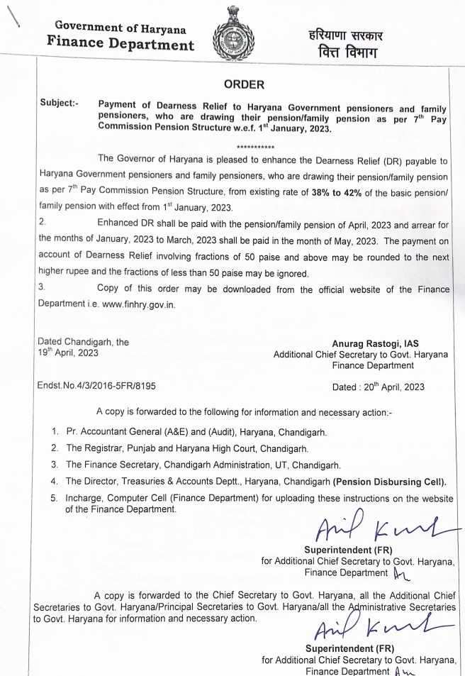 Haryana Government has increased the Dearness Allowance (DA) of Pensioners and Family Pensioners in the State. According to a notice, the Governor of Haryana is pleased to enhance the Dearness Relief (DR) payable to Haryana Government pensioners and family pensioners, who are drawing their pension/family pension as per 7 Pay Commission Pension Structure, from existing rate of 38% to 42% of the basic pension/ family pension with effect from 1 January, 2023.