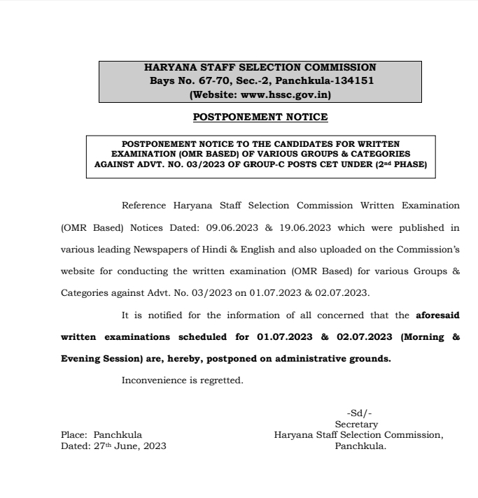 Haryana Staff Selection Commission has released a public notice regarding postponement of written examination for various Group-C posts CET (Common Eligibility Test) IInd phase. As per notice, reference Haryana Staff Selection Commission Written Examination(OMR Based) Notices Dated: 09.06.2023 & 19.06.2023 which were published in various leading Newspapers of Hindi & English and also uploaded on the Commission’s website for conducting the written examination (0MR Based) for various Groups & Categories against Advt. No. 03/2023 on 01.07.2023 & 02.07.2023.