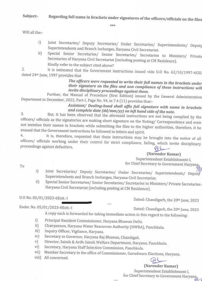 Haryana Government has issued instructions regarding full name in Brackets under the signatures of officers/officials on files. According to the instructions