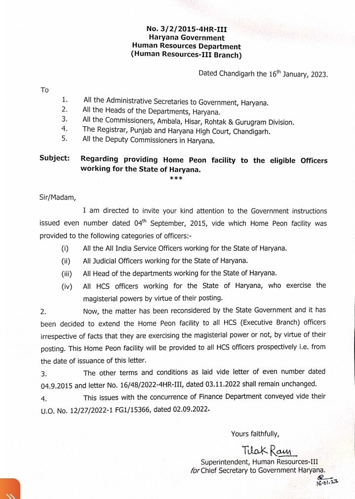 Haryana Government has earlier provided facility of Home Peon to the several officers working in the State. The Government instructions issued even number dated 04th September, 2015, vide which Home Peon facility was provided to the following categories of officers:-